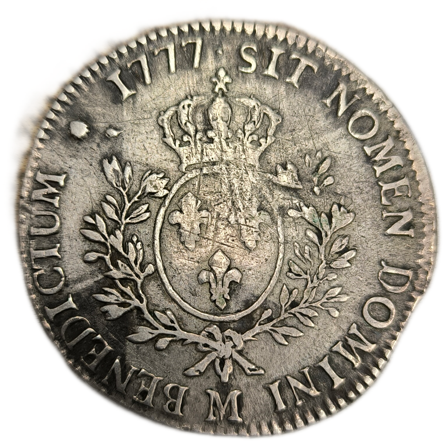 Produit précédent Produit suivant 80.00 € Poids : 28,61 g Diamètre : 42 mm Métal : Argent Année : 1777 Atelier : Toulouse Qualité : TB+ Rupture de stock UGS : 251740 Catégorie : Archives Produits similaires Épuisé ArchivesCoriosolites (région de Corseul, Côtes d’Armor), statère nez pointé classe II 150.00 € Lire la suite Épuisé ArchivesHenri III, demi-franc au col plat 1588 Bordeaux 130.00 € Lire la suite Épuisé ArchivesFerdinand et Isabelle, 1 réal Grenade 50.00 € Lire la suite